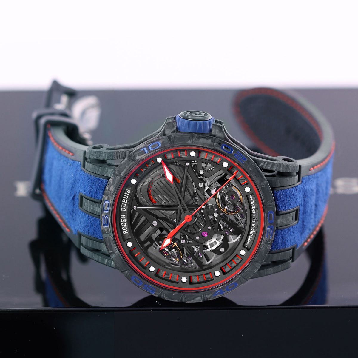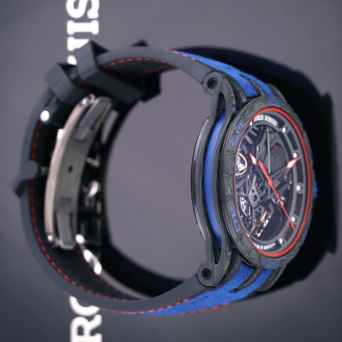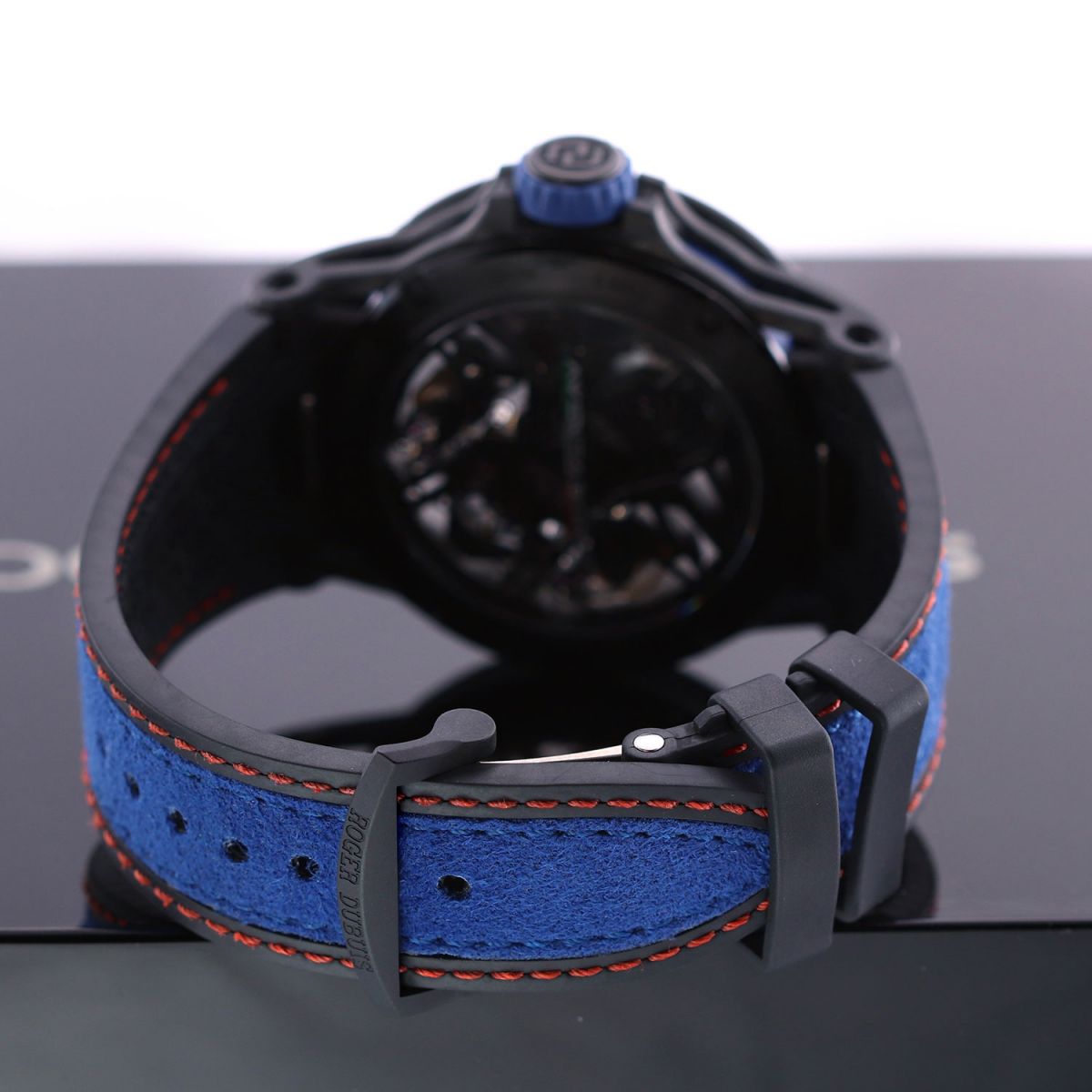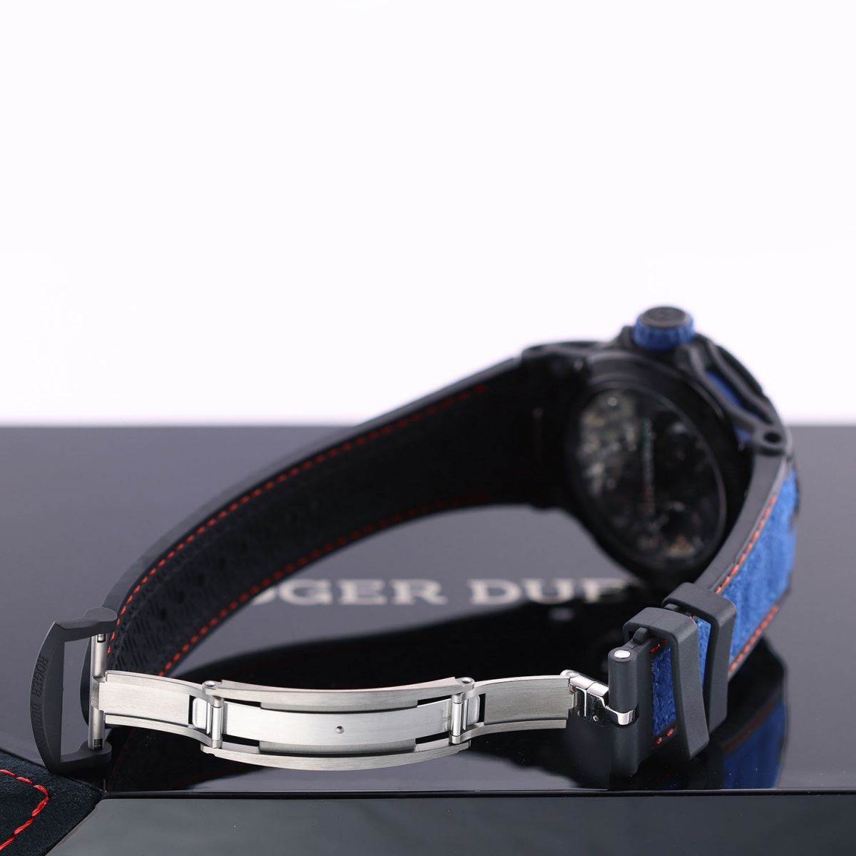 - Fitted on its original Roger Dubuis black rubber with blue Alcantara® inlay with a butterfly style black DLC coated titanium deployant buckle. The strap is papers brand new & unworn with its full wear lifespan remaining.