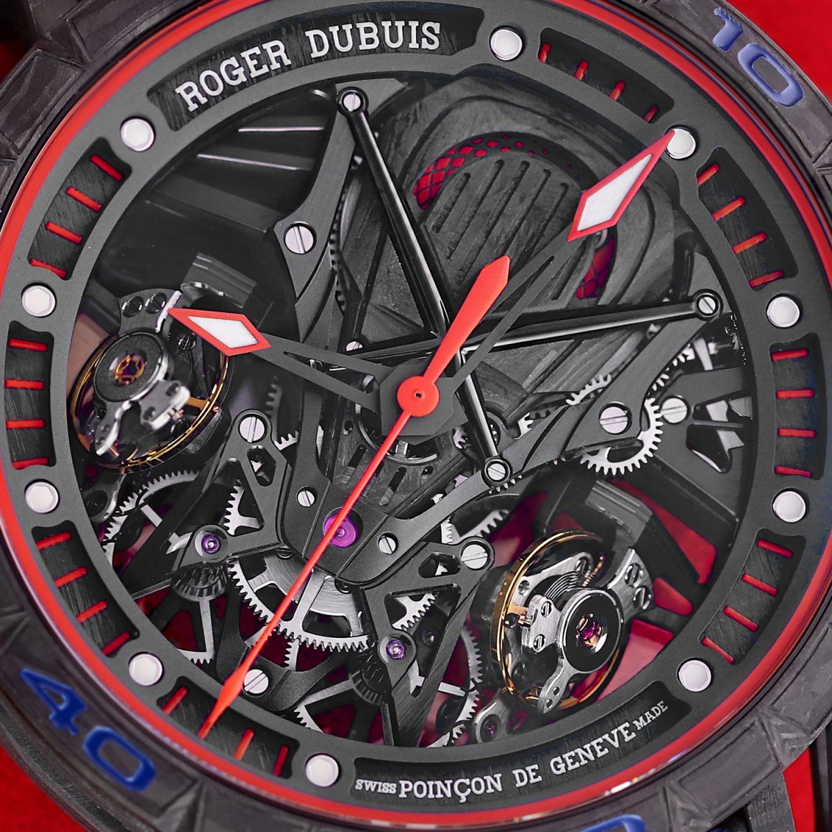 Movement: Powered by an in-house Roger Dubuis caliber RD103 SQ, manual winding, beats at 28,800 vph (4Hz), composed of 312 components, contains 48 jewels & has a power reserve of 40 hours. Black hour & minute hands with red & luminous filled arrow-head tips. Red central seconds hand.