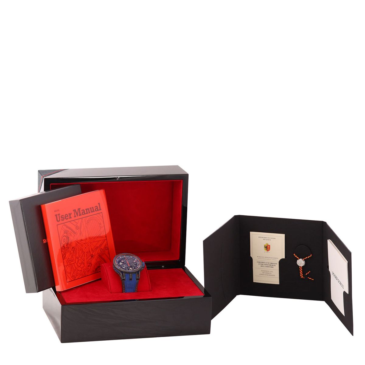 Case: Black carbon fiber case with a titanium and blue rubber middle case. Fixed position black carbon fiber bezel with lacquered blue 60 minute scale. Black DLC titanium & sapphire crystal case back. Blue rubber & carbon fiber crown. Black carbon fiber lower dial-flange with red minutes/seconds track. Black upper dial-flange cage with luminous screw-like hour markers.