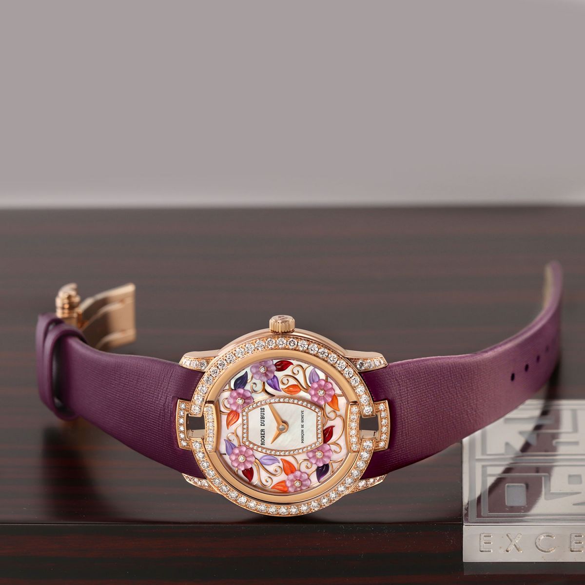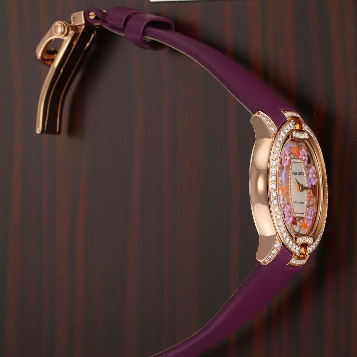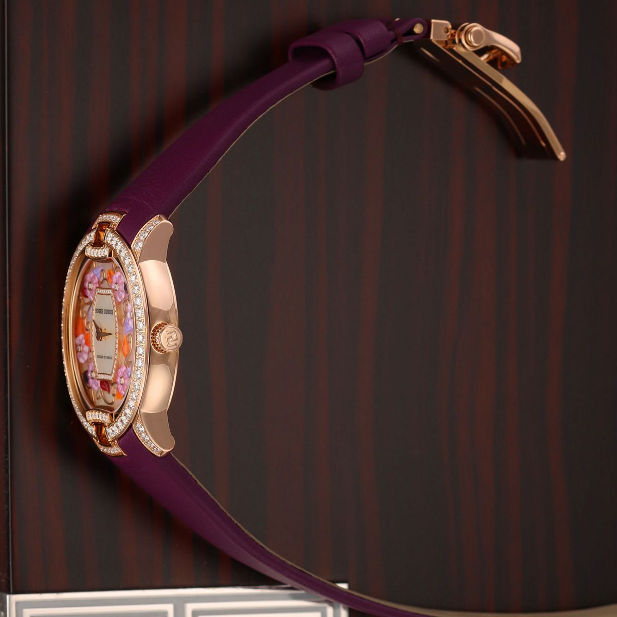 Natural mother of pearl main dial set with a row of diamonds in a tonneau shaped ring. The dial is decorated with flowers & leaves made of carved enamel in matching colors with branches in polished 18kr rose gold. The center of each flower is set with a brilliant-cut diamond.