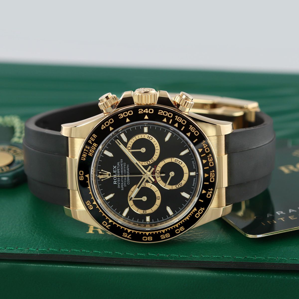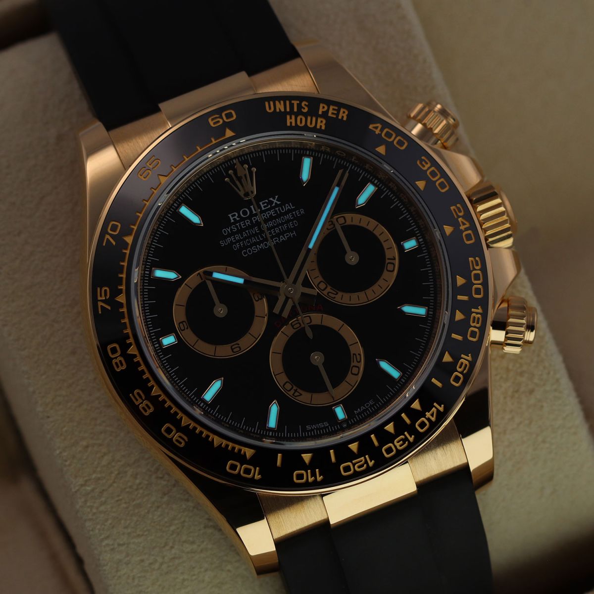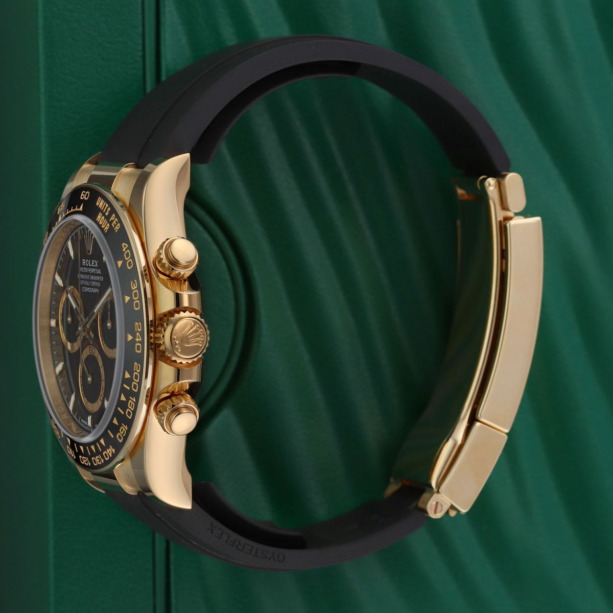 Strap: Fitted on its original Rolex Oysterflex strap, constructed of flexible metal blades overmoulded with high-performance elastomer. Features a solid 18kt yellow gold folding Oysterlock safety clasp with a Glidelock Extension System.