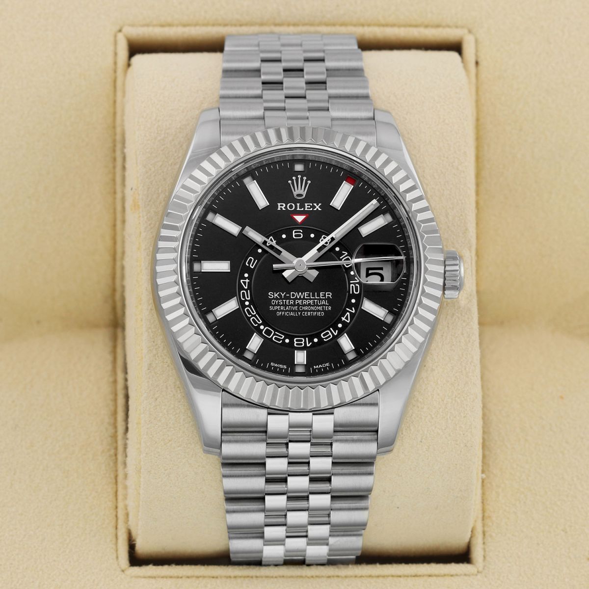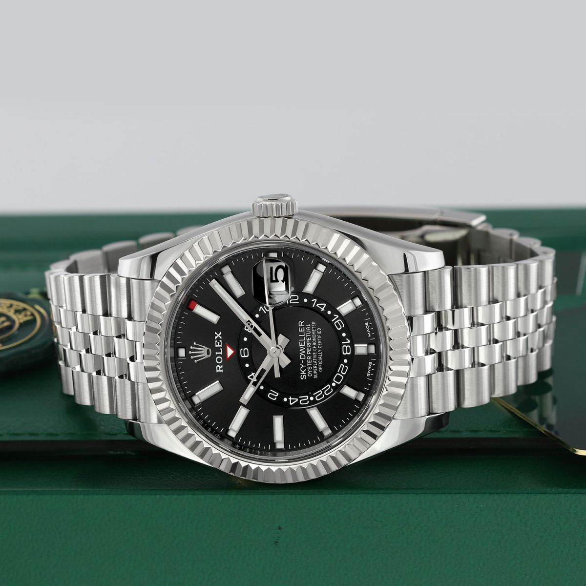 Case: Polished stainless steel case & Twinlock screw-down crown. Polished 18kt white gold fluted bezel. Black dial. Polished hands. Partially skeletonized minute & hour hands so not to obscure the dual time. Hour & minute hands with luminous filled tips. Applied white gold index hour markers with luminous fill. Printed minute/seconds track on the dial perimeter. Features: