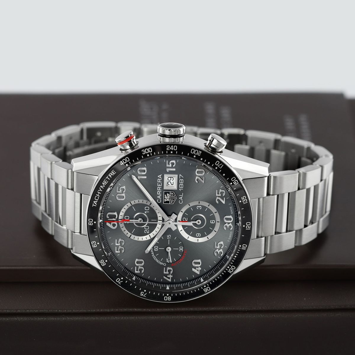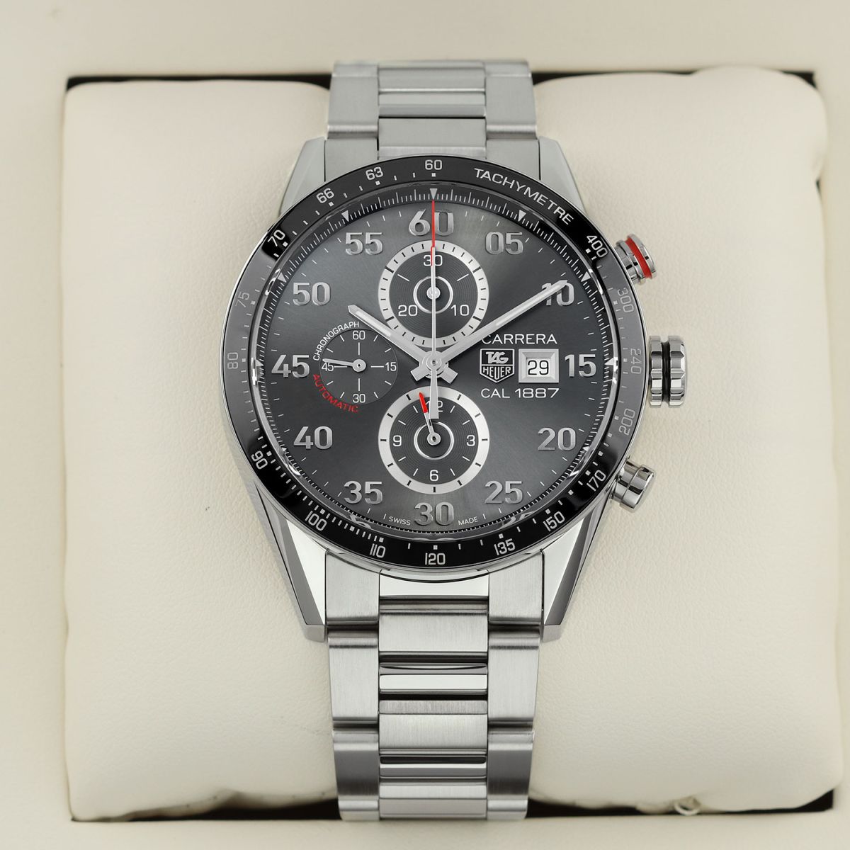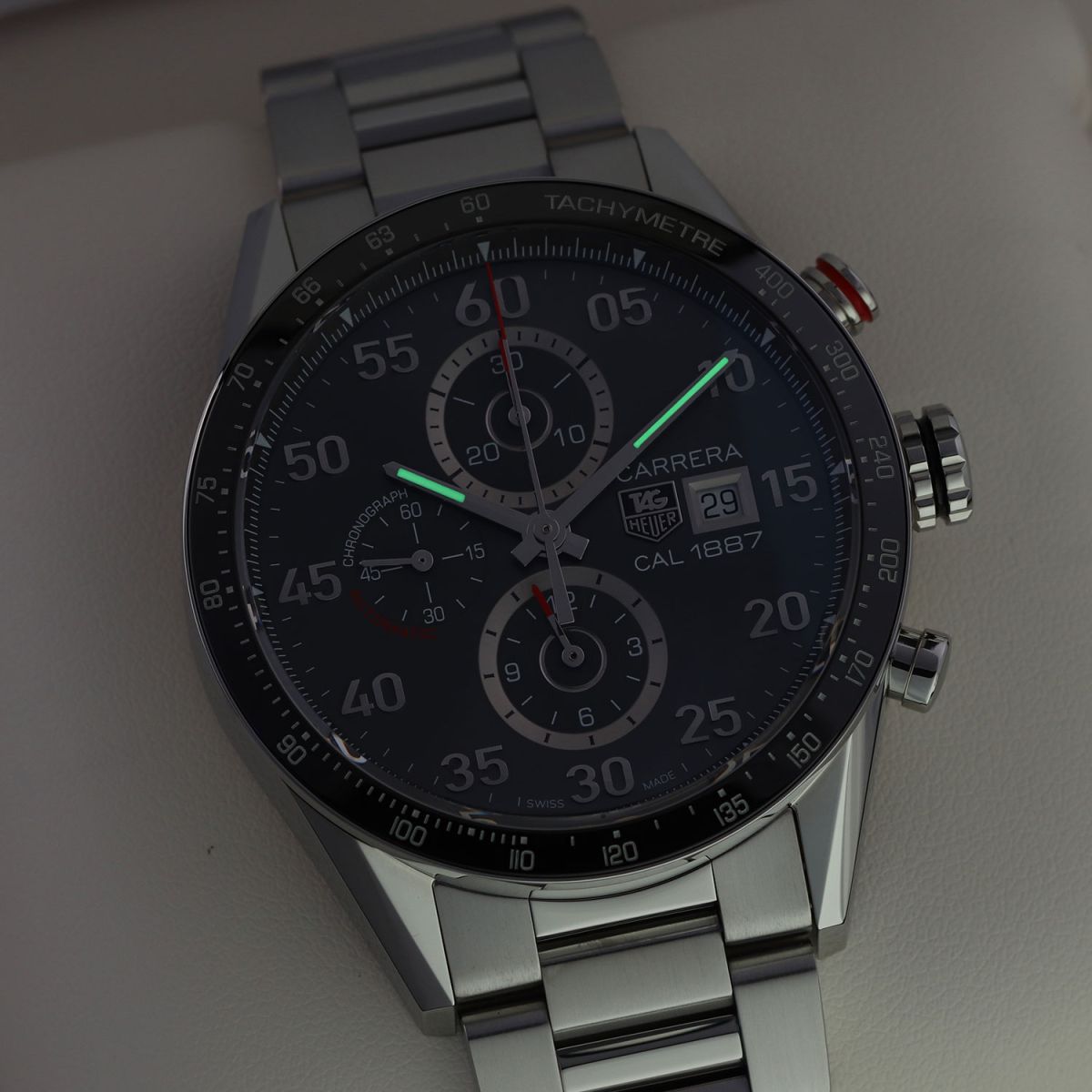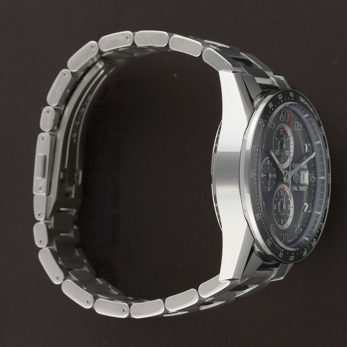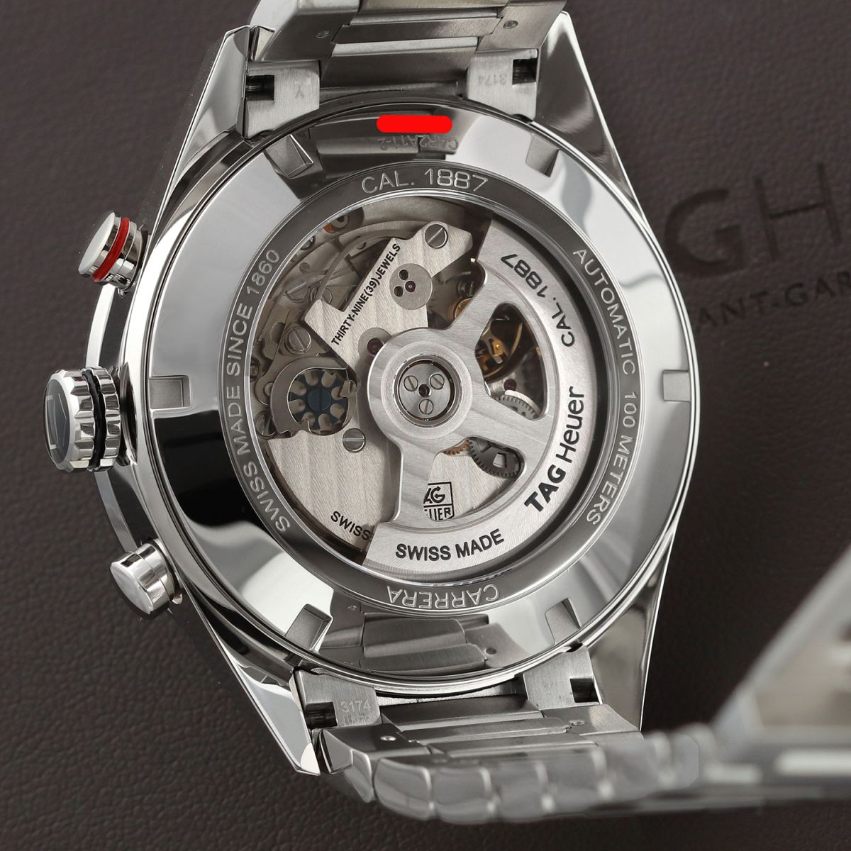 Movement: Powered by a TAG Heuer caliber 1887, beats at 28,800 vph, contains 39 jewels & has a power reserve of +/- 50 or +/- 40 hours when the chronograph is running.