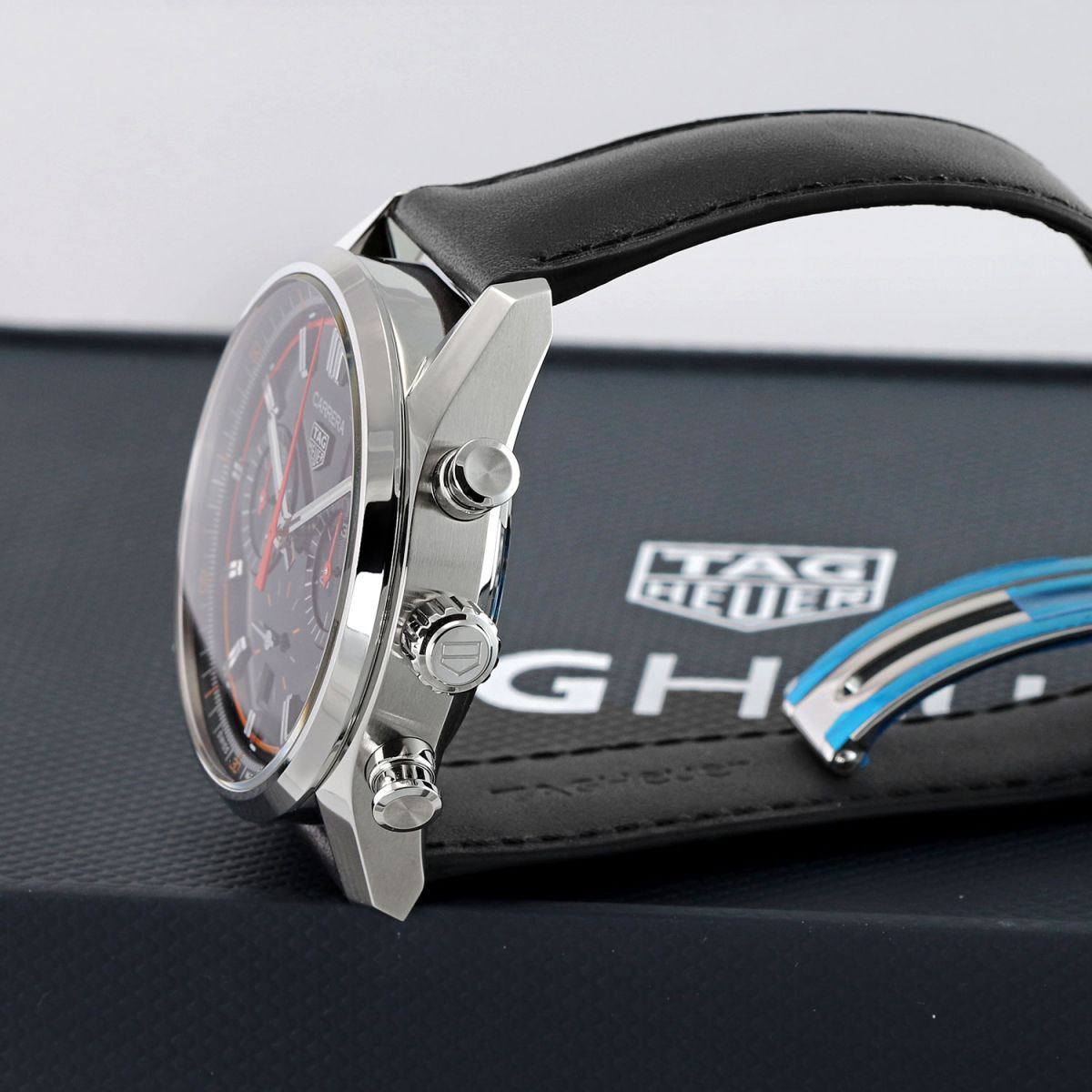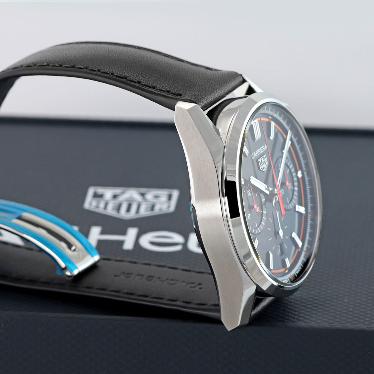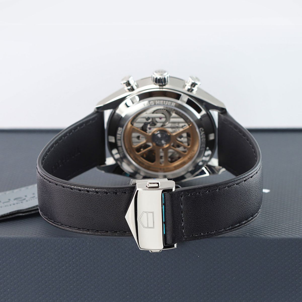 Strap: Fitted on its original TAG Heuer black calfskin leather strap with a push-button stainless steel deployant buckle. The strap is unworn in new condition with its full wear life-span remaining.