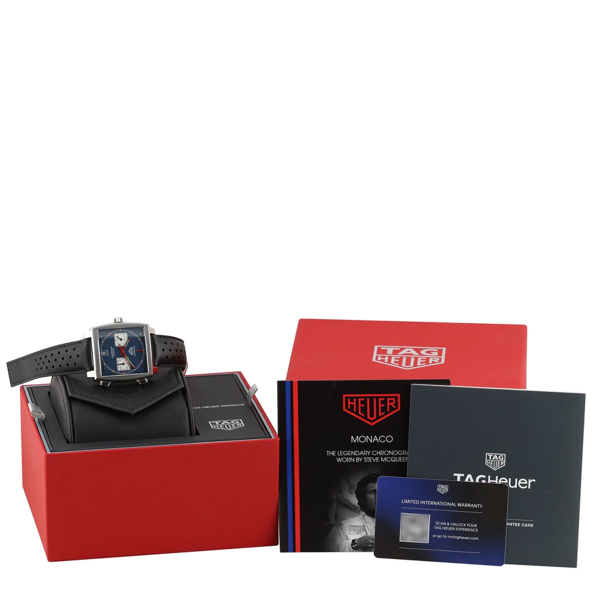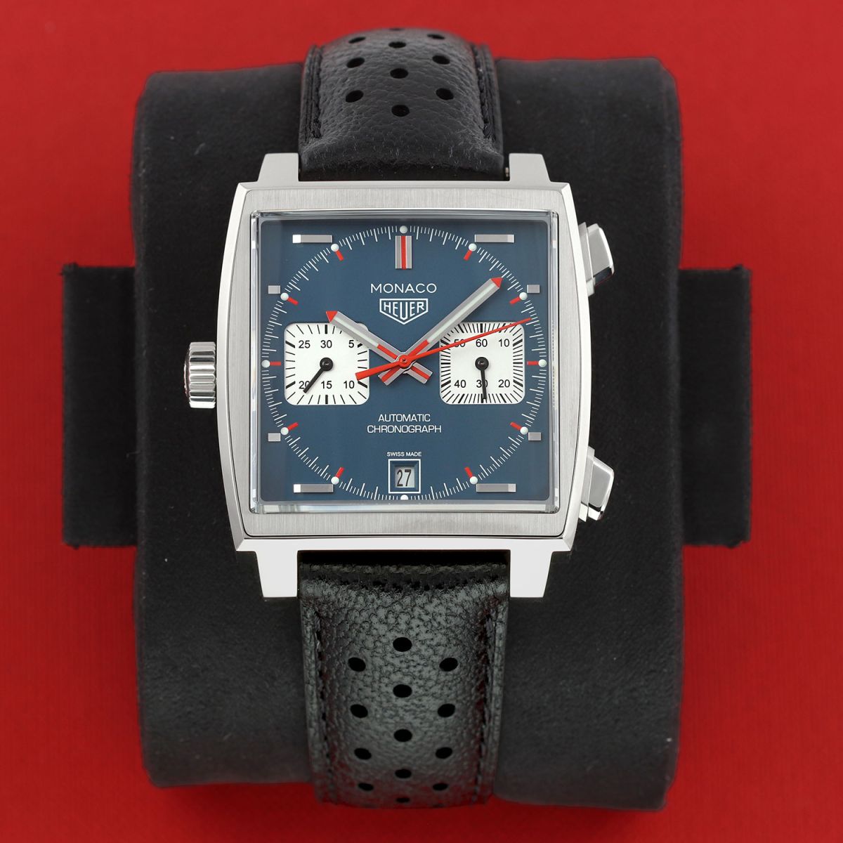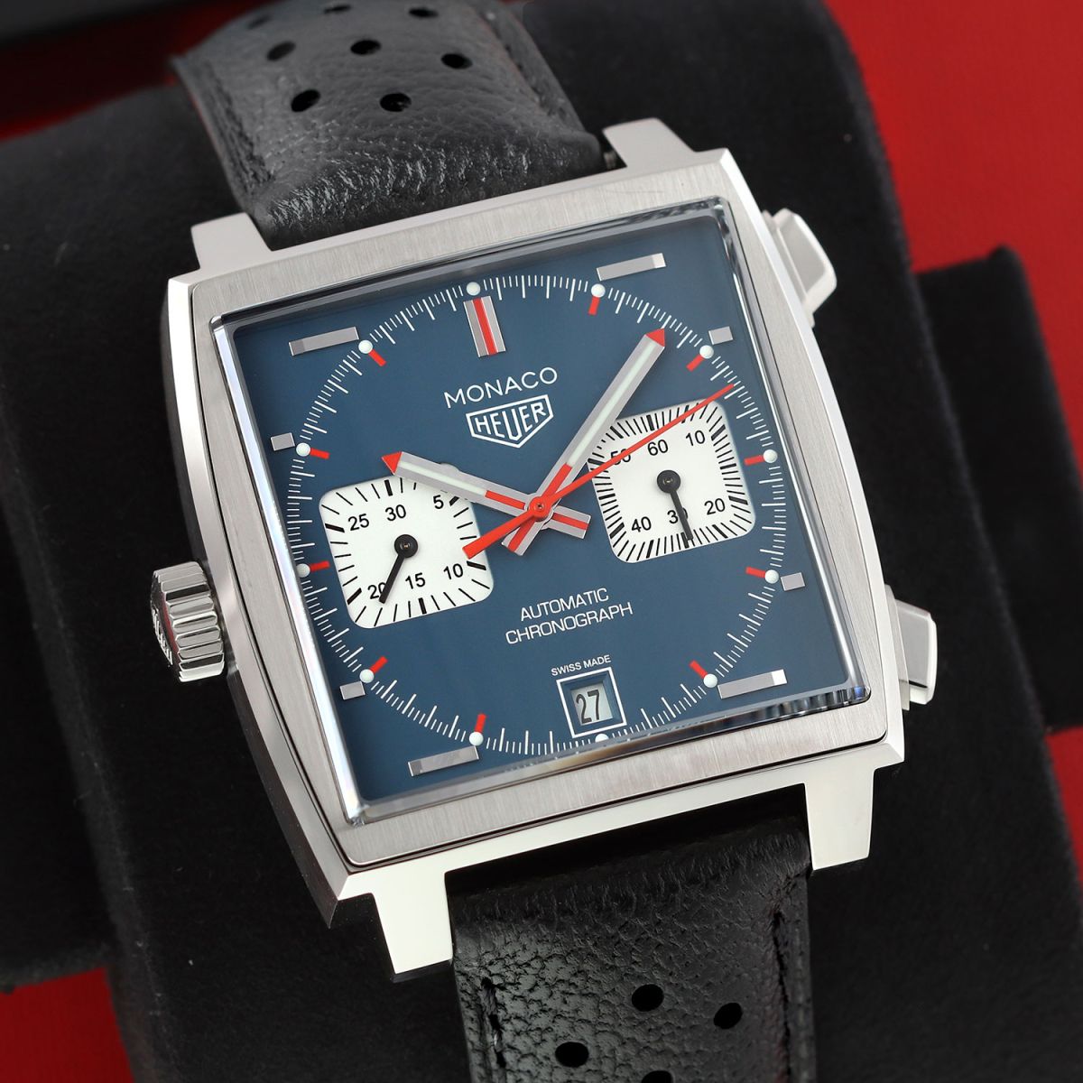 Monaco Caliber 11, re-edition of the original Steve McQueen Monaco watch with the crown on the left side.Case: Brushed & polished stainless steel case. Matte blue dial, silver sub-dials. Applied horizontal index hour markers. Polished hour & minute hands with red accents & luminous fill. Blackened steel sub-dial hands. Fine printed minute/seconds & fractions-of-a-seconds track. Red indexes & luminous dot hour markers. Small seconds sub-dial at 3 o'clock. Date window at 6 o'clock.