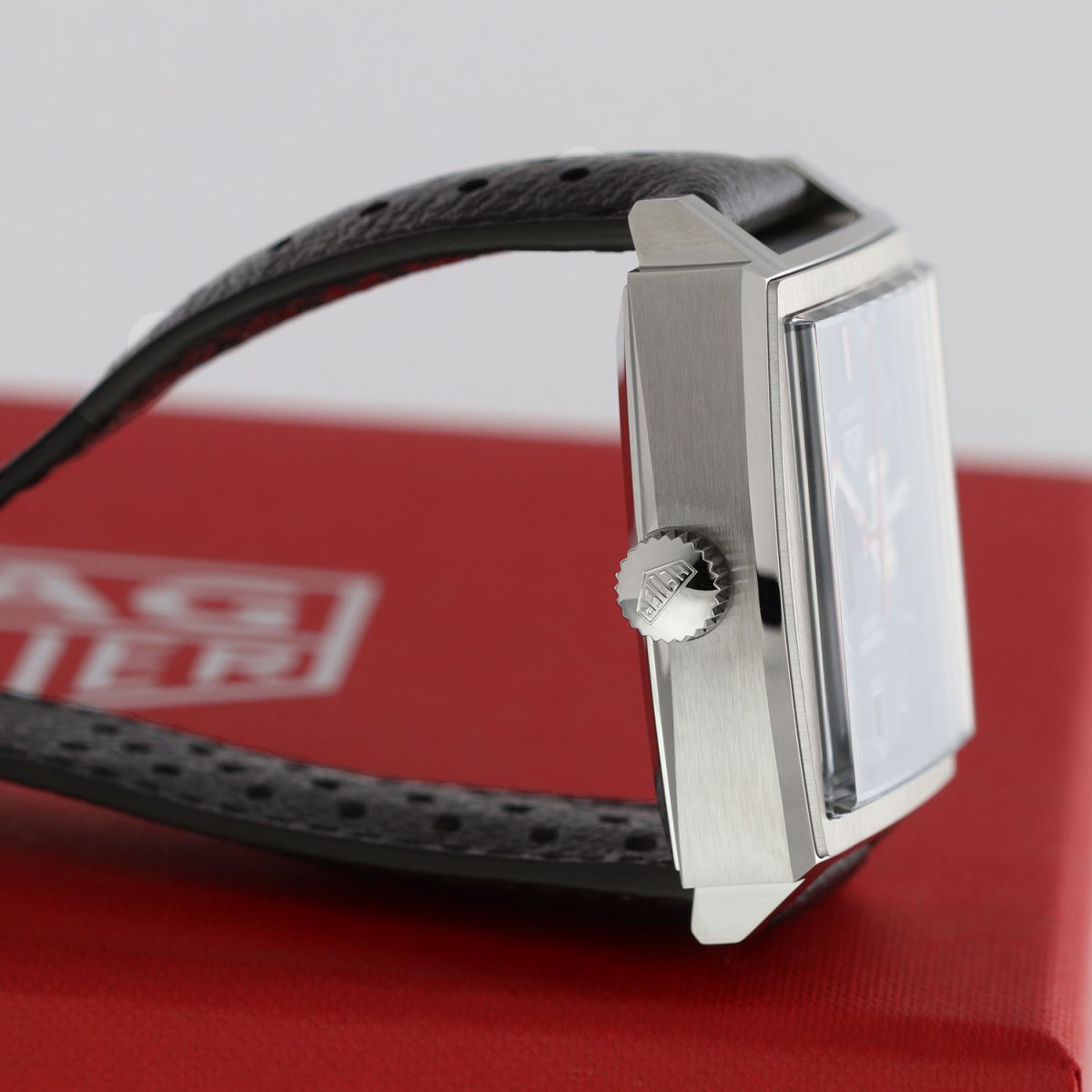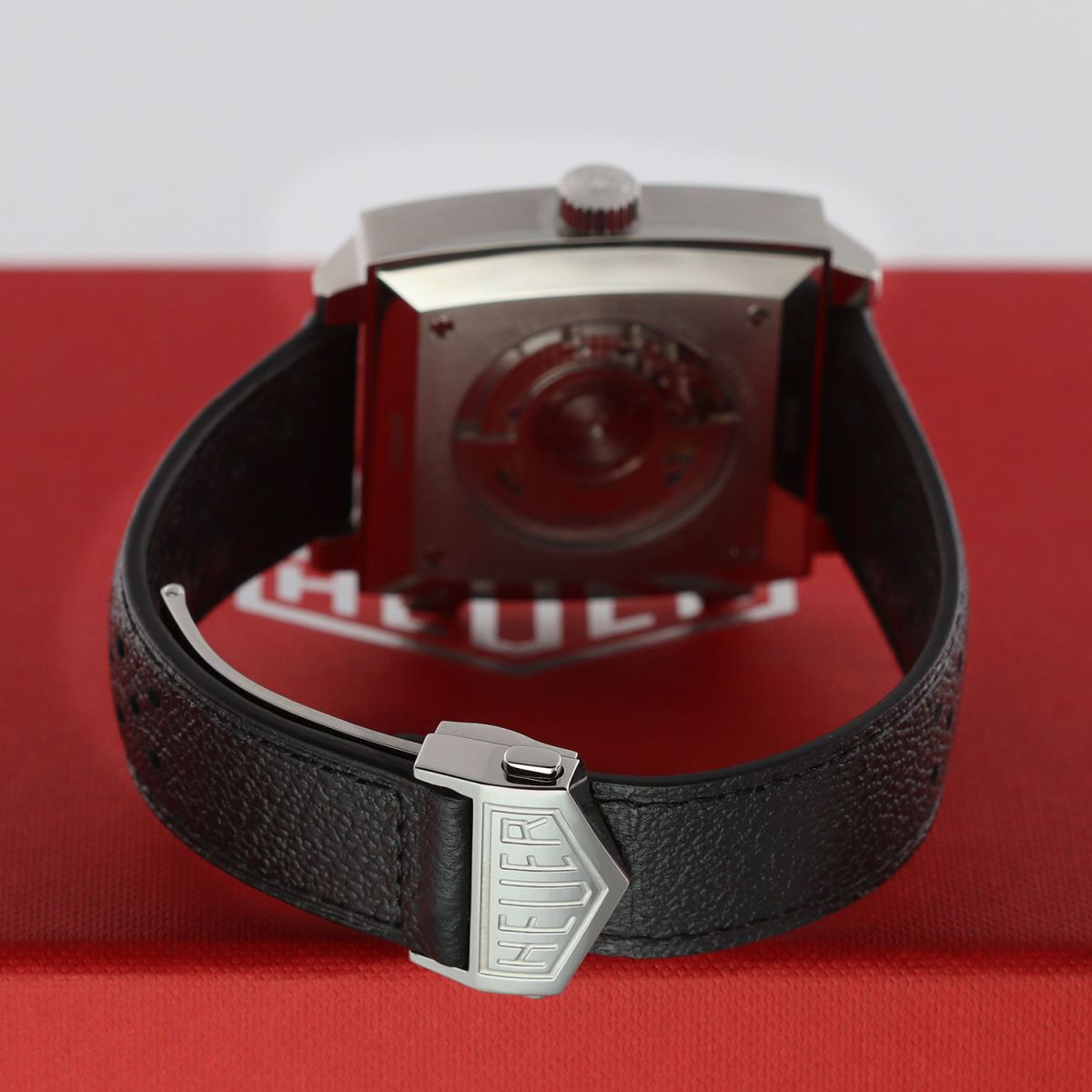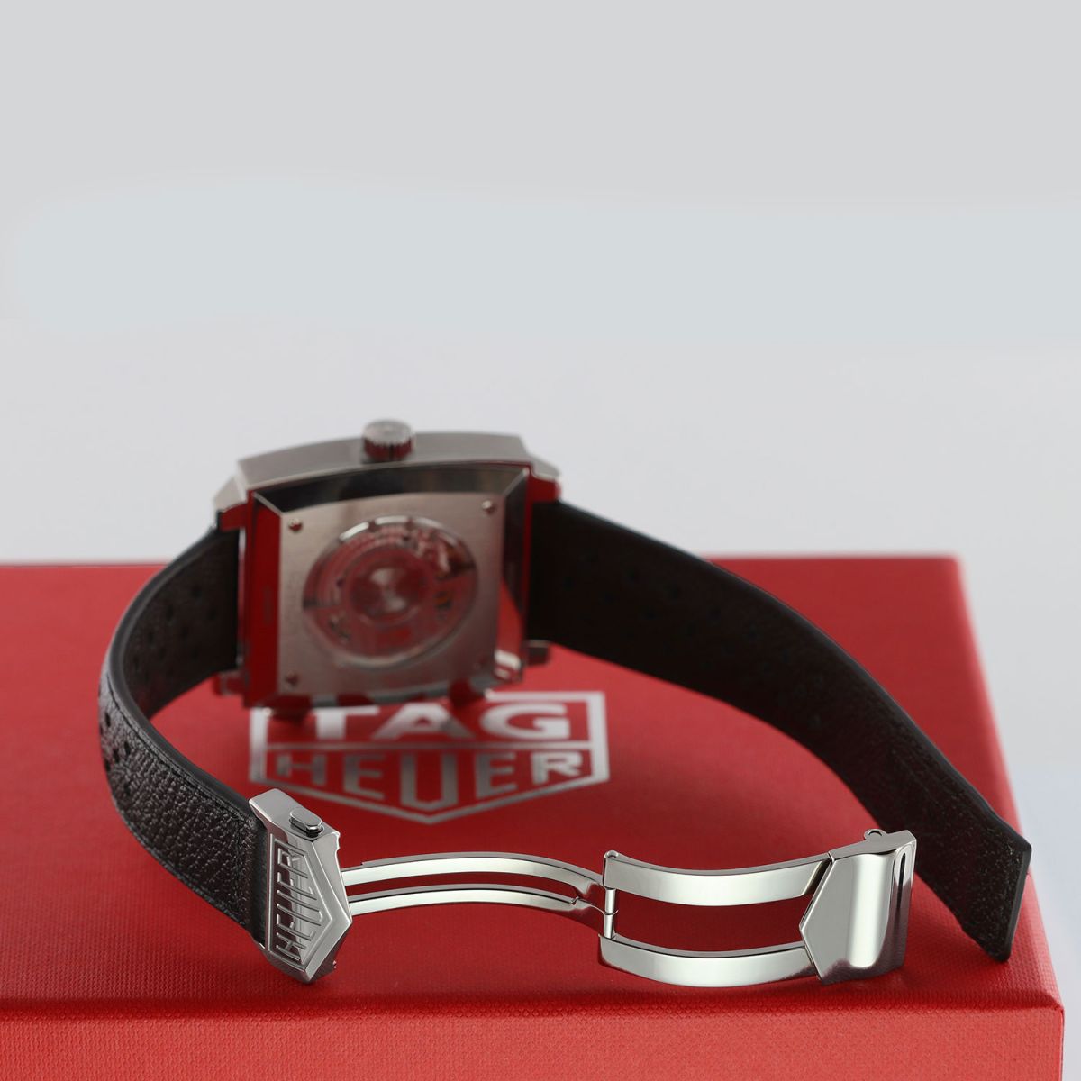 Monaco Caliber 11, re-edition of the original Steve McQueen Monaco watch with the crown on the left side.Case: Brushed & polished stainless steel case. Matte blue dial, silver sub-dials. Applied horizontal index hour markers. Polished hour & minute hands with red accents & luminous fill. Blackened steel sub-dial hands. Fine printed minute/seconds & fractions-of-a-seconds track. Red indexes & luminous dot hour markers. Small seconds sub-dial at 3 o'clock. Date window at 6 o'clock.