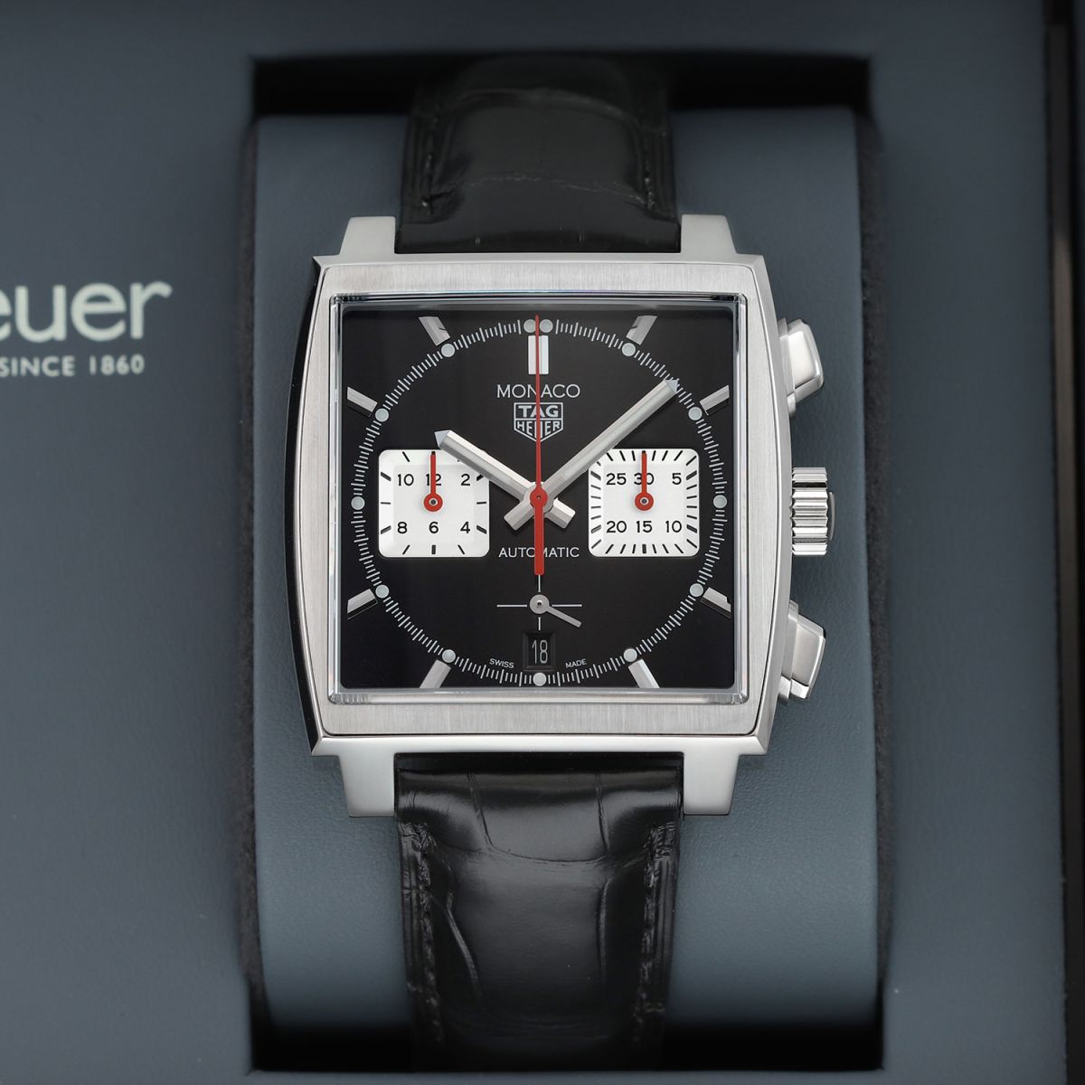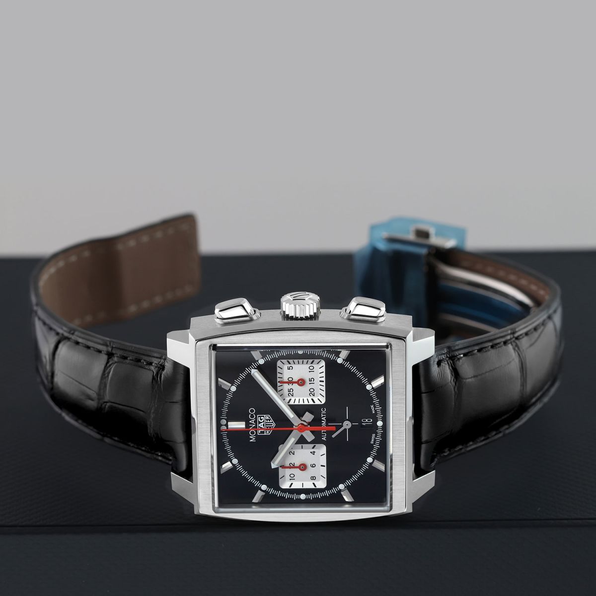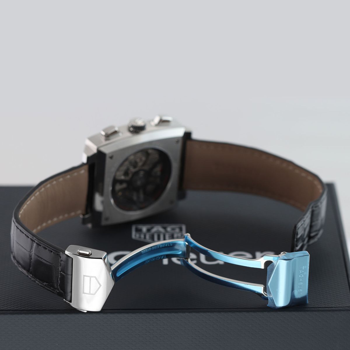 Strap: Fitted on its original TAG Heuer black alligator leather strap with a push-button stainless steel deployant buckle. The strap is unworn in new condition with its full wear life-span remaining.