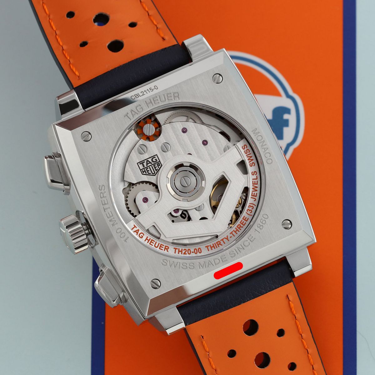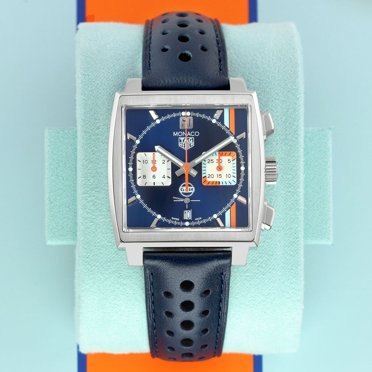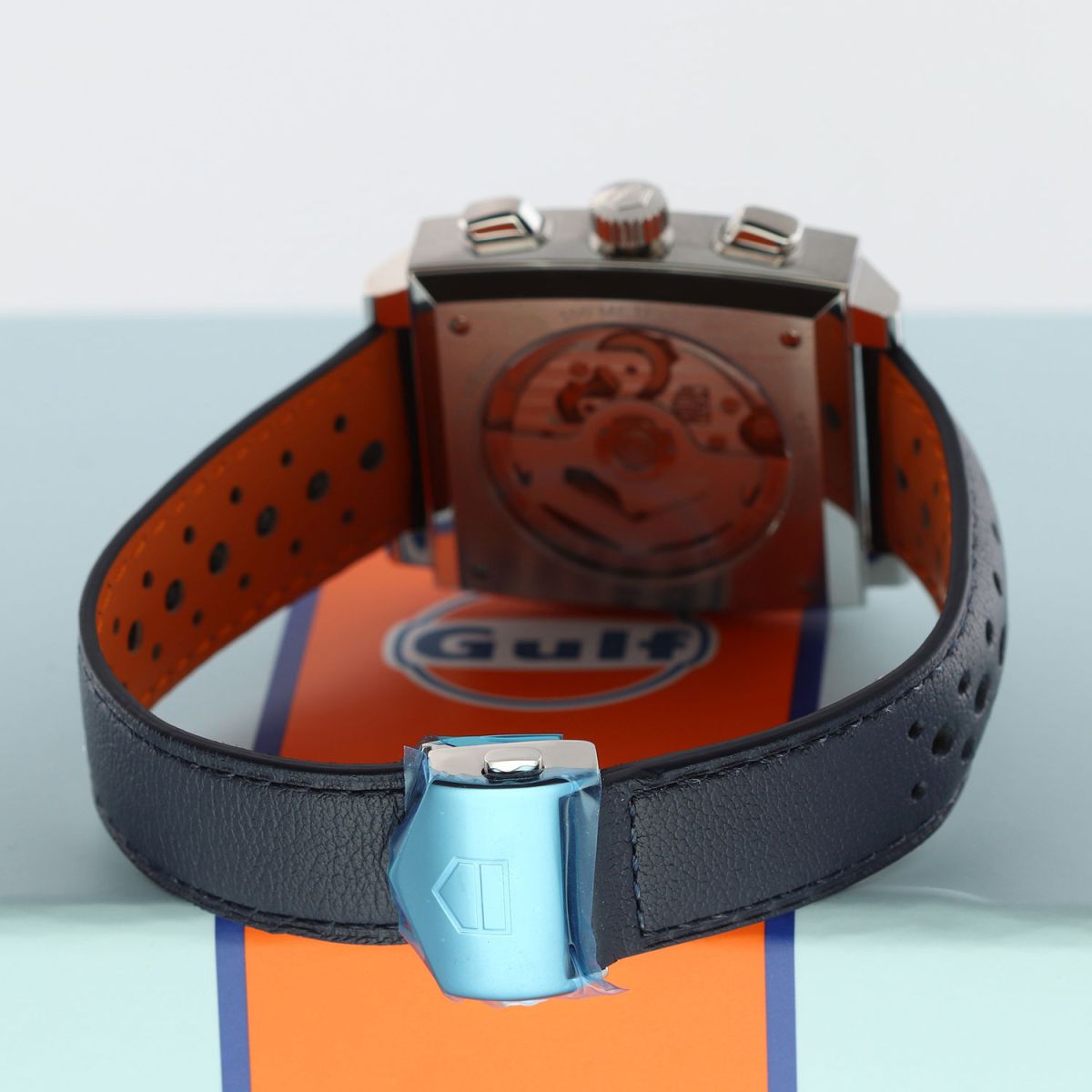 TAG Heuer MONACO Gulf Automatic Chronograph. The dial features the co-branding of TAG Heuer & GULF logos & highlighted with the iconic light blue & orange colored stripes