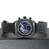 Case: Black carbon fiber case. Skeletonized dial with grey treated bridges. Blue sapphire crystal sub-dials. Black & white minutes & hour hands with luminous fill. Blue & red auxiliary hands. Applied blue luminous index hour markers. Grey dial flange with fine printed minutes/seconds & fractions of a sections track. Black outer flange with Tachymeter & Pulsometer scales. Small seconds sub-dial at 6 o'clock. Date window at 9 o'clock with skeletonized date wheel & a luminous background.