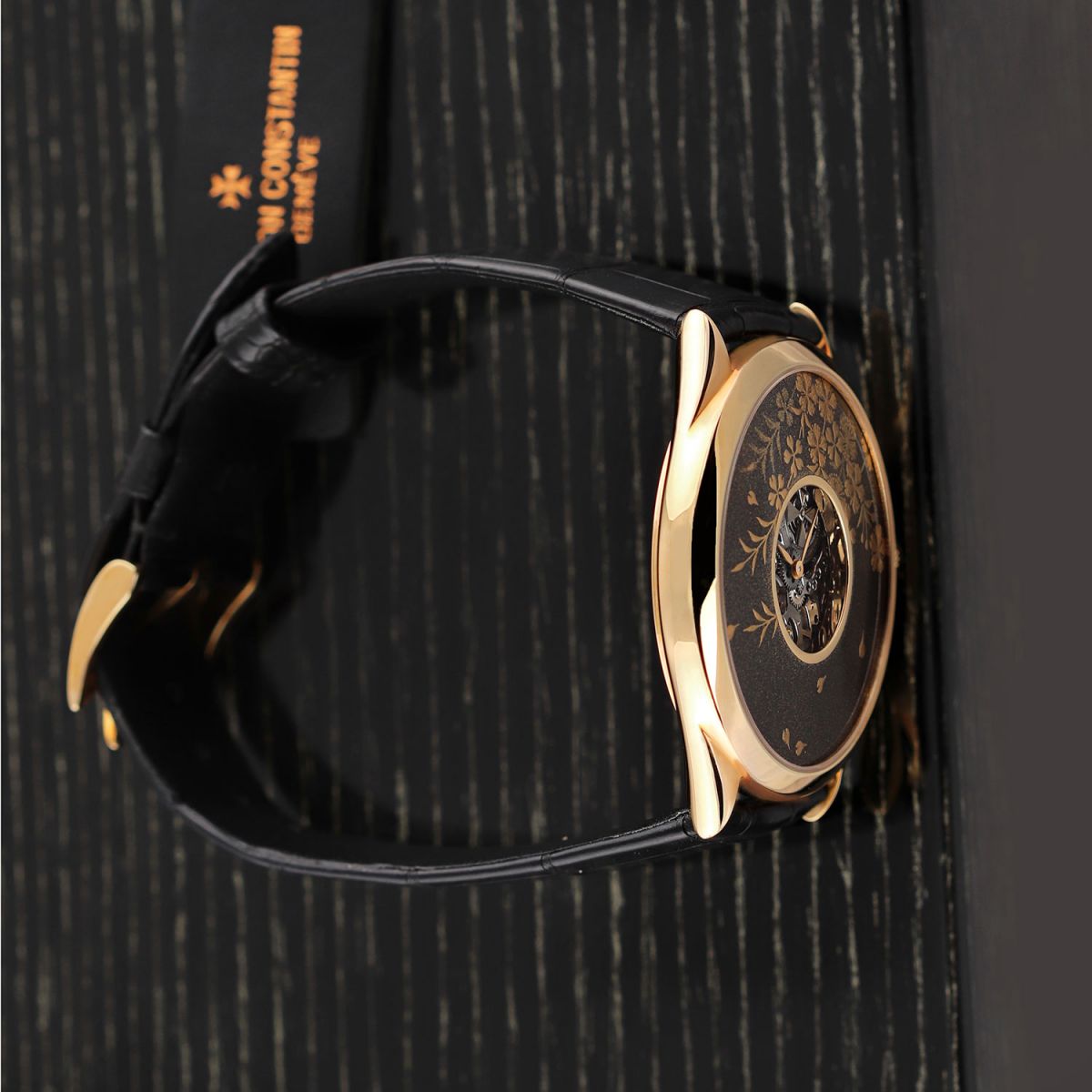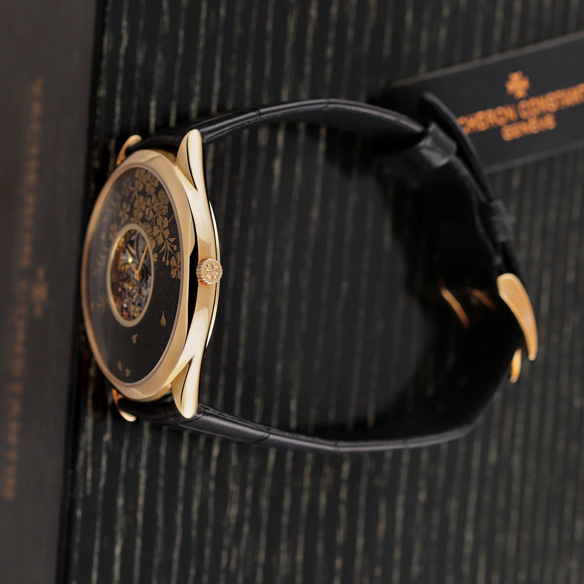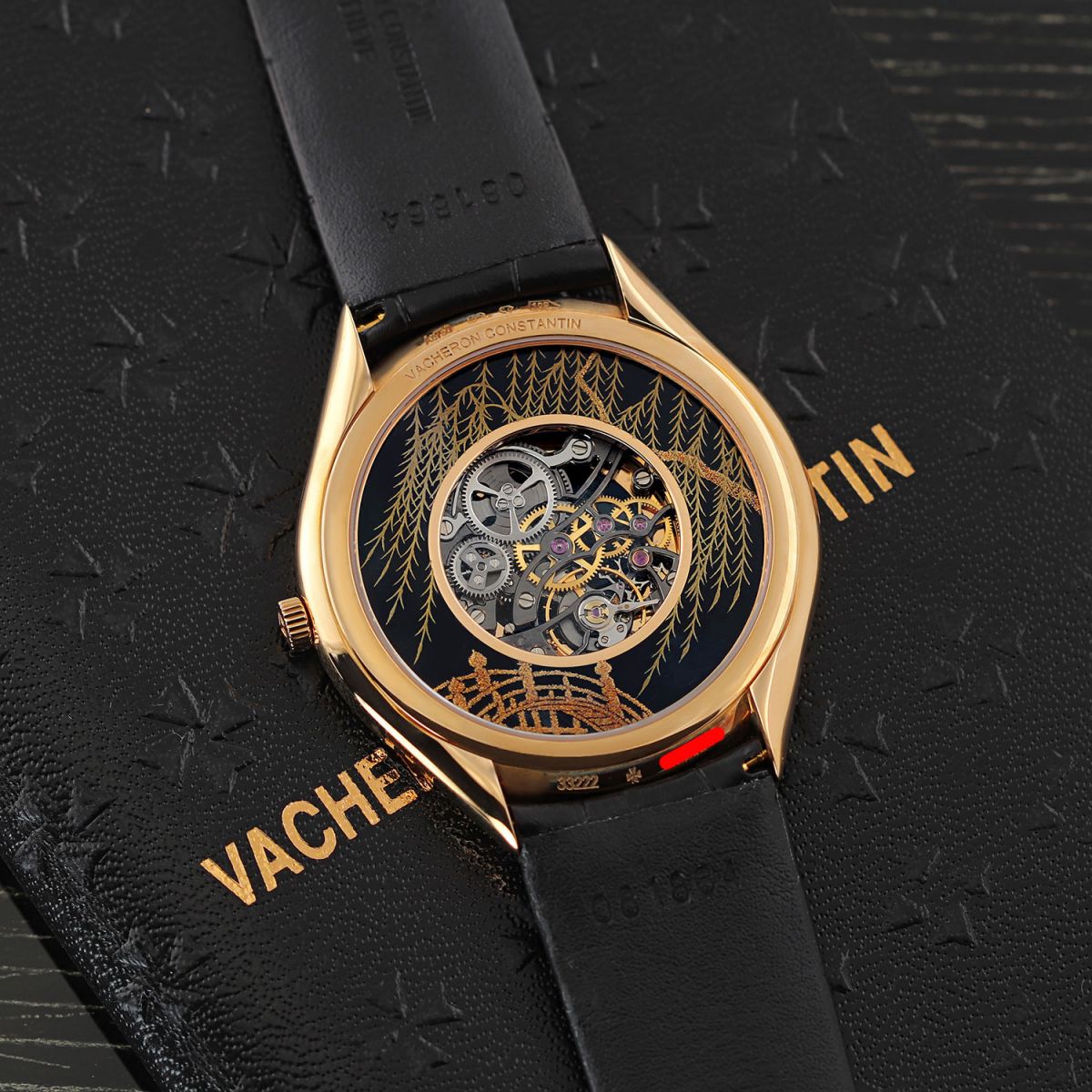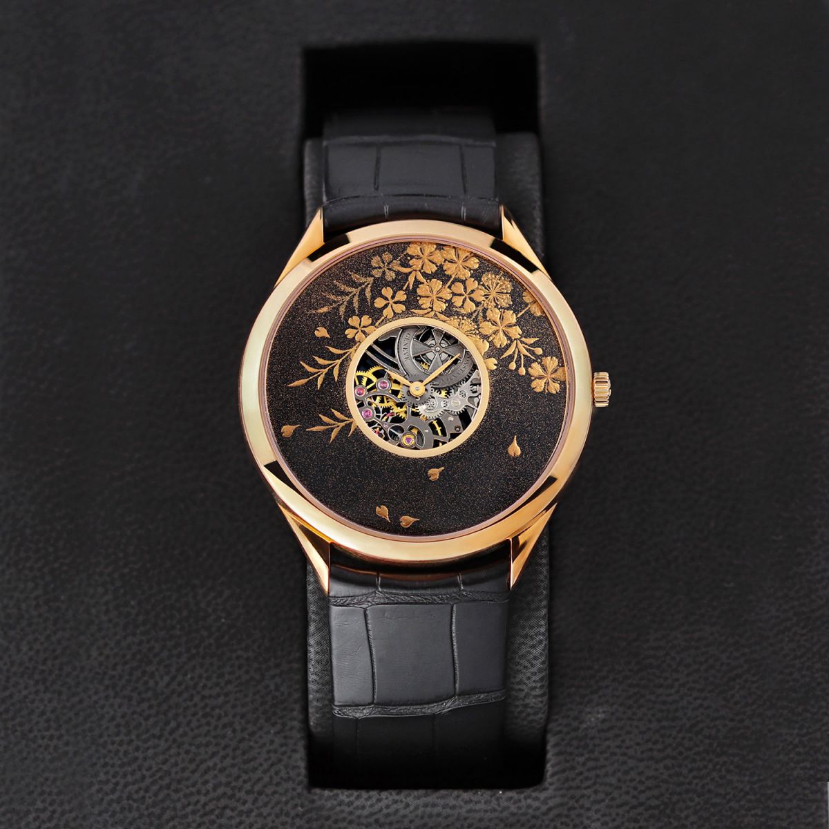 Case: Polished 18kt rose gold case. Black decorated enameled front & black dial. Central dial cutout on both the front & back dials for a partial view of the skeletonized movement. Polished rose gold hands.