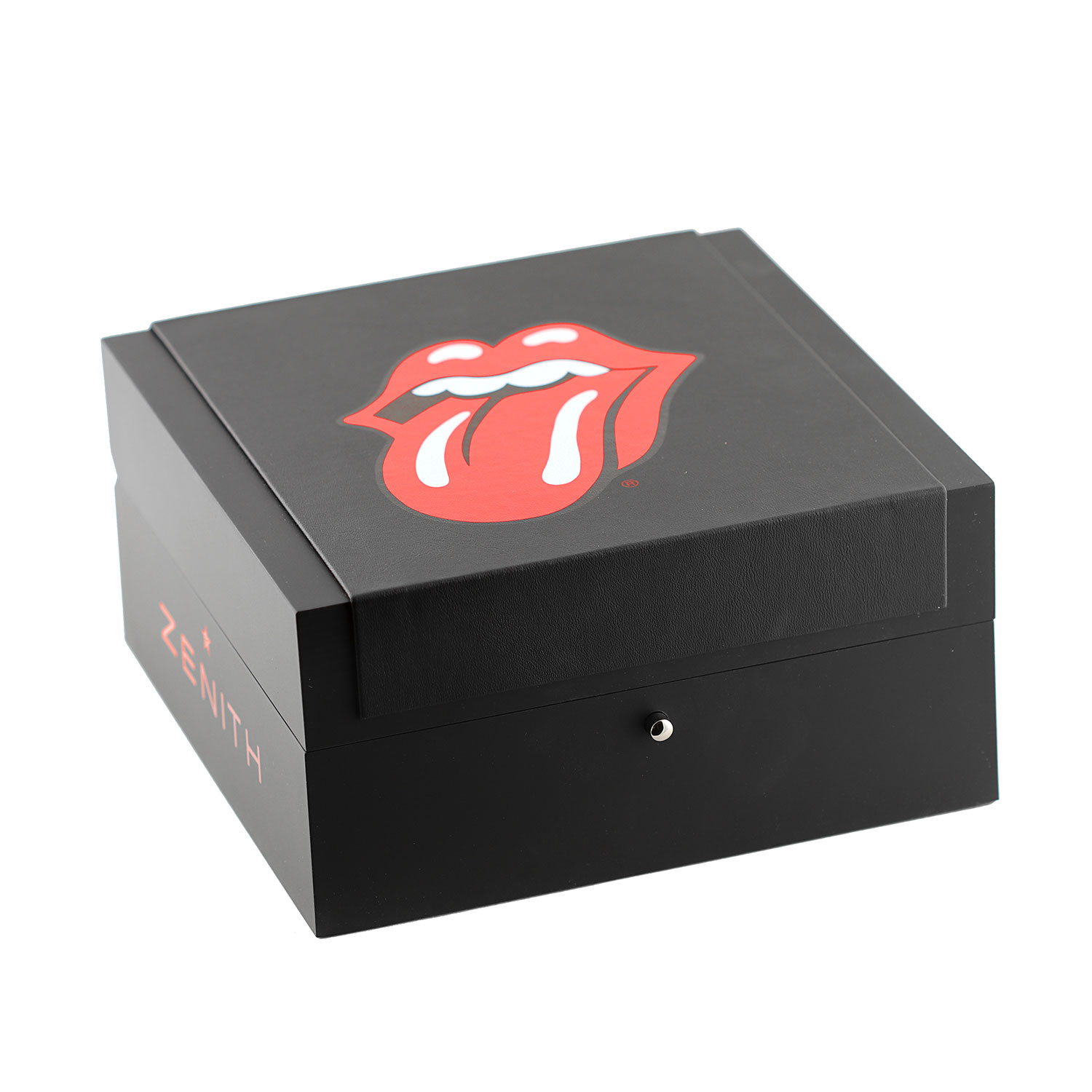 TRIBUTE TO THE ROLLING STONES: The black rubber strap is topped with a layer of calfskin & adorned with a UNION JACK flag. The Rolling Stones signature red tongue logo is embossed on the rotor. Delivered in a special Rolling Stones themed box.